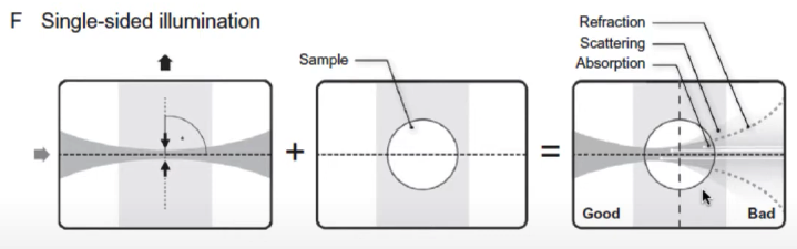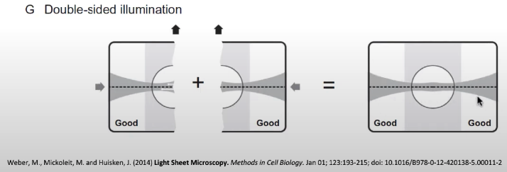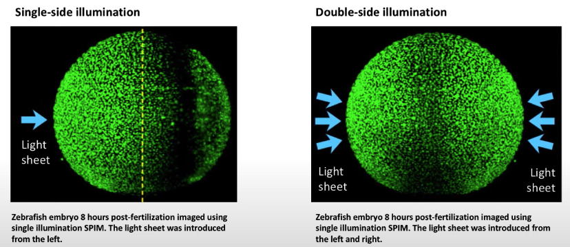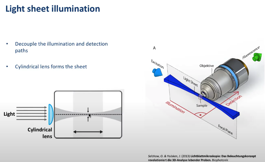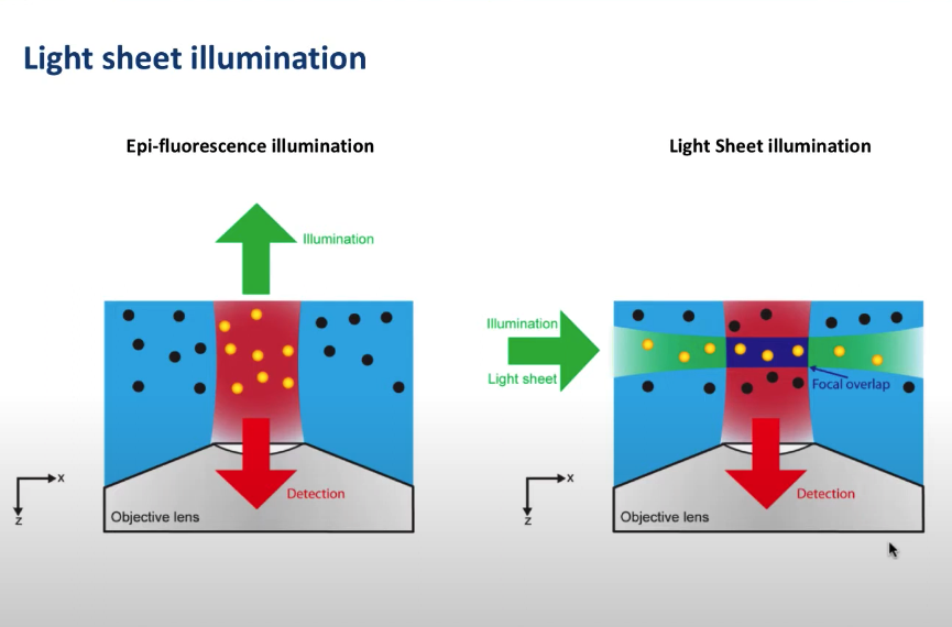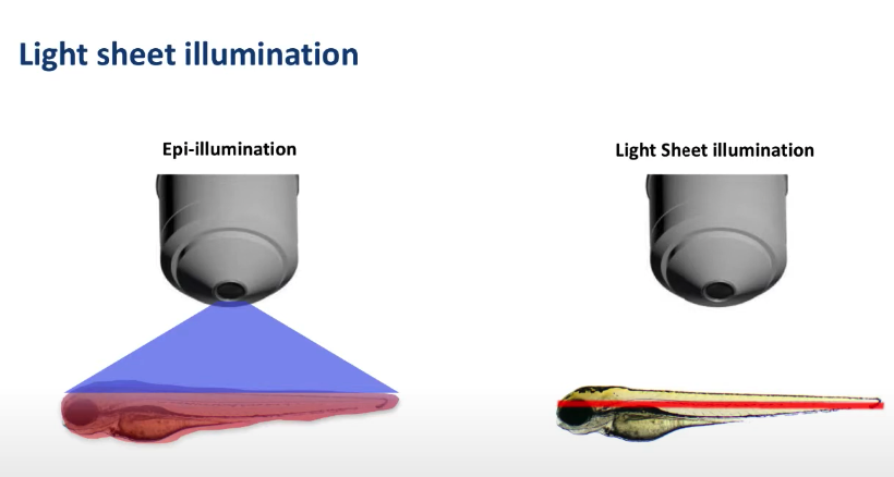 In a light sheet microscope, a thin sheet of laser light is used to illuminate the sample from the side, perpendicular to the direction of detection. This method reduces the exposure of the specimen to the intense illumination, minimizing damage and allowing long-term imaging of delicate or sensitive samples.