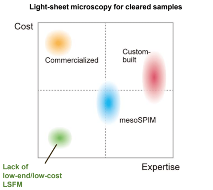 The main features of descSPIM are: Easy-to-build Easy-to-operate (use a cuvette / no oil chamber) Affordable ($20k-50k for descSPIM-basic, depending on the number of lasers) Compact (all parts on a 300 mm x 450 mm breadboard)Versatile (highly expandable and customizable)## Who is the descSPIM for?