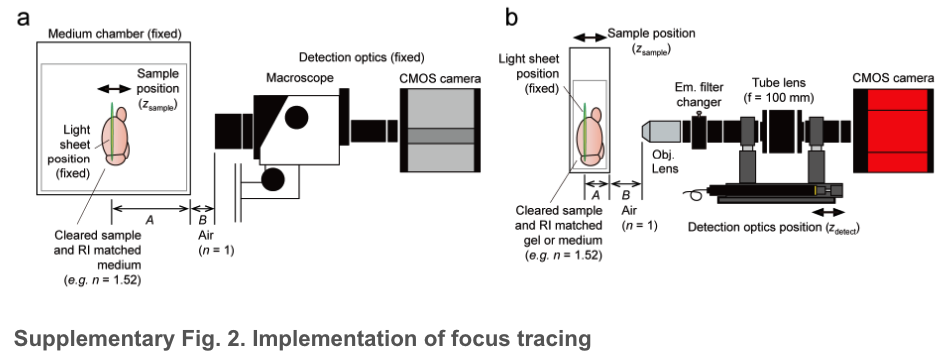 a. A conventional system with a positionally fixed medium chamber fulfilled with a clearing reagent or a RI-matched immersion oil (e.g., n = 1.52). The sample is moved along the z-axis within the chamber. In this case, the ratio of A (the distance from the chamber wall to the light-sheet illumination, with RI of the immersion reagent) and B (the distance from the objective lens to the chamber wall, with RI of the air (1.0)) is fixed.