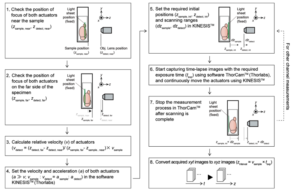 b. descSPIM sample imaging method employing a cuvette as a sample container. In this case, due to the movement of the sample chamber (the cuvette) during imaging, the ratio of A and B is altered, resulting in defocus. descSPIM applies synchronized movement of the sample stage (zsample) and the detection optics (zdetect) to prevent the defocus. See Supplementary Fig. 4 and Methods for details on how to calculate the synchronous speed correction value (the relative velocity of two actuators).